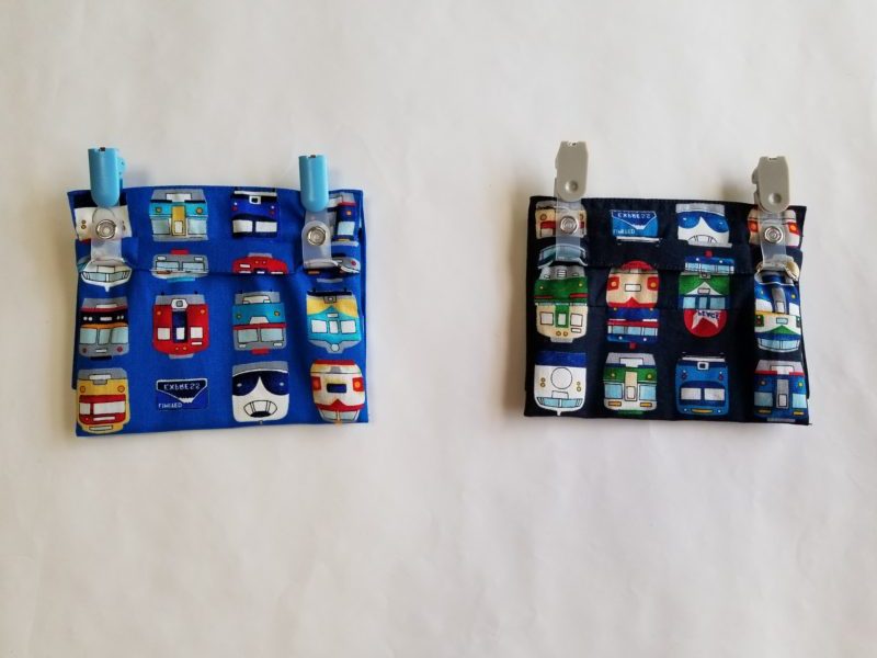 トレーン柄のポケットティッシュケースと玉付きファスナーミニポケットの移動ポケットに仕立てました。