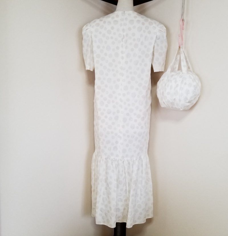 大小のドット柄で、凹凸・シワ加工のロングワンピースとバッグになります。