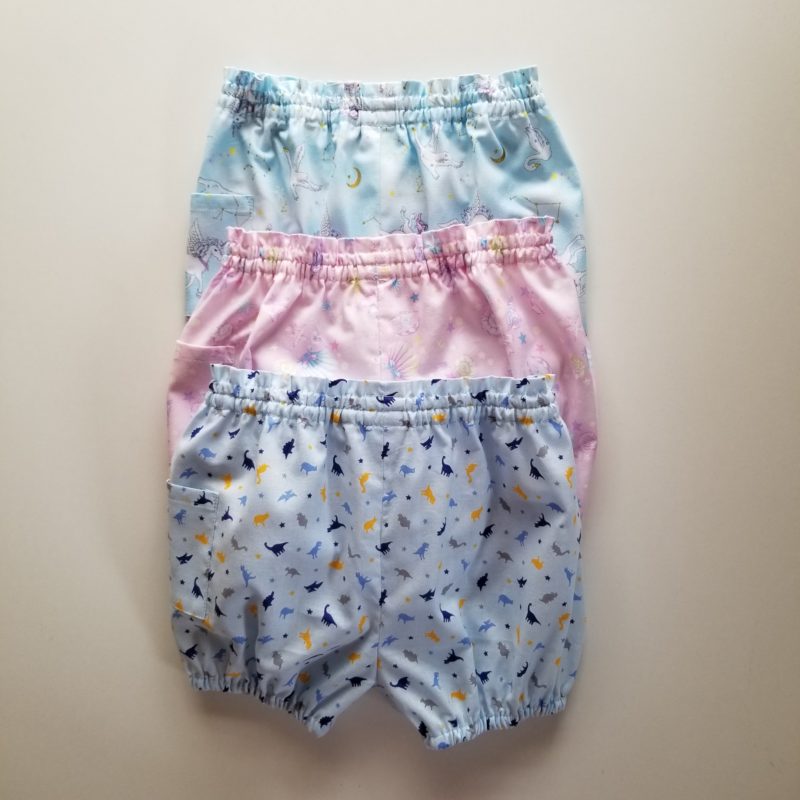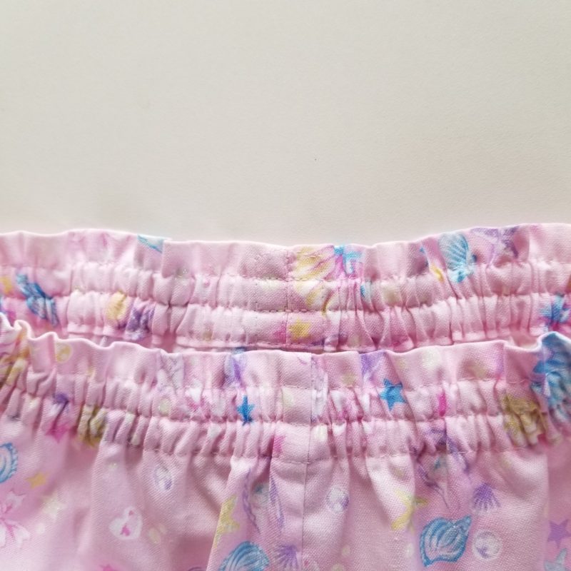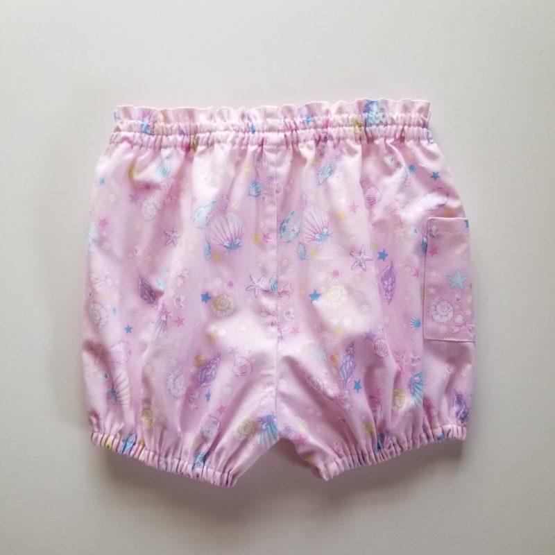 ピンクの生地に貝殻柄が可愛いパンツ ウエスト・裾にゴムの入った伸縮の為、着脱しやすいパンツになっております。ウエスト前中心・裾の又下側にゴム交換口を作りました。